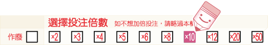 2.可選擇加倍投注。加倍投注時,該組投注之投注總金額即為該組原投注金額乘以所選倍數之總和。