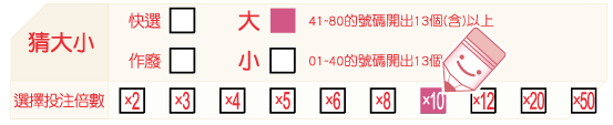 下圖「猜大小」玩法為猜「大」,並選擇10倍的投注倍數。