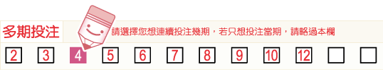 您可以利用選號單上的「多期投注」欄位,就該張選號單上的投注內容連續投注2~12(含當期),如果您不想投注多期,則不需要填寫該欄。